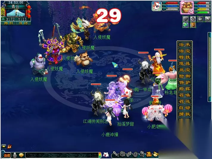 【入侵妖魔的战斗】 入侵妖魔(犀牛将军造型):开场破血狂攻点杀、第二回合变身后狮搏 入侵妖魔(地狱战神造型):开场锢魂术点杀、第二回合释放鬼泣法宝 入侵妖魔(独角鬼王造型):开场三昧真火点杀、第三回合释放无魂傀儡法宝 入侵妖魔(金翼造型):开场断岳式或天崩地裂点杀、第二回合裂石 入侵妖魔(野猪精造型):横扫千军点杀、第三回合释放无魂傀儡法宝 入侵妖魔(强盗狸造型):誓血之祭点杀、第三回合防御 战斗难度:较高 战斗回合:4回合 击杀方法:封系可开场封印“地狱战神”,防止中锢魂术死亡。怪随机点杀我方防御和血量较少的一个单位,有无底洞的话建议开场金蟾加护盾。或者血少防低玩家开场先防御一回合。 注意事项:对面点杀阵容,只点杀中了锢魂术的玩家,如果点杀成功对面怪会逃跑。