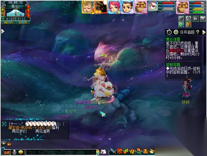 梦幻西游新增加了侠士副本青丘迷雾,通关副本可以获得许多奖励,233乐园小编为大家准备了详细的通关攻略流程,可以参考流程迅速通关。 副本名称:青丘迷雾 副本类型:侠士副本 副本条件:≥50级,5人开启 任务时间:180分钟 进入副本:大唐国境(青丘使者154.9),选择“青丘迷雾”选项进入副本 副本流程: 与花铃对话→采集紫藤花(需战斗)→交给涂山雪→与花铃聊天→与狐不归会合→与狐不归商量→找青丘护卫→听涂山瞳说什么→玉笛交给涂山雪→找青丘侍女返回青丘→修复裂痕(需战斗)→找到白衣妖狐(需战斗)→押送至涂山雪面前→与花铃对话→问竹居找寻足迹→寻找阿宝→阻止兽变的阿宝(需战斗)→找青丘护卫打听→与花铃对话→潜入藏书阁→共同前往青丘→开启月镜湖入口(需战斗)→阻止涂山雪 (需战斗)→副本结束 副本官员(长安151.184)开启副本后进入,会观看一段涂山雪“黑化”的动画,可跳过