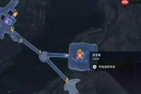 1、从【安全屋】出发,走上桥面,来到改造台附近靠近黄色建筑; 2、猫咪就在建筑旁边。