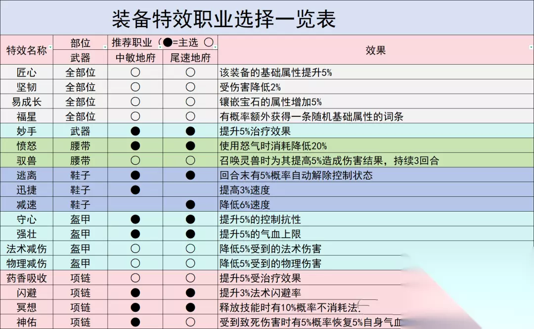 6.装备特效推荐: ●=主选 ○=次选 空格=不推荐 地府核心特效是妙手和愤怒腰带,其他的话不用过分强求,负敏地府最好是有【减速】