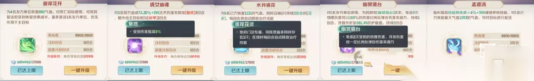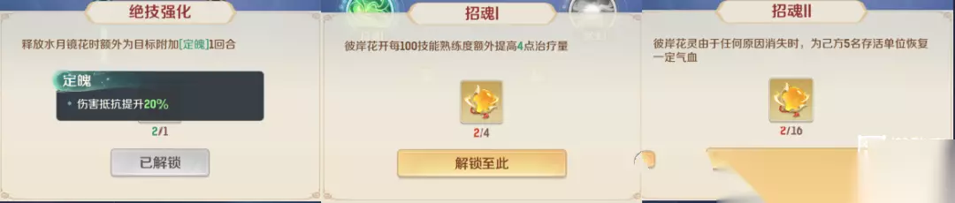 ①彼岸花开: 主要恢复技能,也是地府的核心技能之一!治疗量只和技能熟练度、装备宝石天赋等增加的治疗有关系,和法伤无关 ②孟婆汤: 提速治疗/复活单位,中速地府能比全敏方寸都快,可以理解为1速度复活技能!负敏地府复活方寸比较难,复活盘丝和输出单位基本速度足够! ③倩女幽魂: 唯一输出技能,并且会附加易伤5%3回合,主目标还会碎甲降低5%防御,任务或者PVP中记得点选要集火的那个单位再释放哟! ④幽冥镜台: 保人技能,可以加护盾并反弹2次物理伤害,任务和PVP中神技! 但是,负敏地府基本可以扣掉这个技能了。。。。只有中速地府有用 ⑤水月镜花: 强力治疗技能,还会召唤1个花灵,每回合持续释放治疗技能 地府在队伍中的作用主要是承担队伍的恢复和复活,需要有强大的回复量,否则队伍血线给压下去的话,很容易在第四回合团灭! 除了合理的释放师门技能外,还要有合理的特技搭配,愤怒腰带几乎需要是标配,另外搭配群体性特技,为队伍提供特技效果贡献! 2.加点推荐: 中速地府:1-2敏、剩下根骨+耐力,尽量比蛮岳快 负敏地府:3根骨2耐或2根骨3耐,生存能力极强 3.1转天赋推荐: 推荐左边招魂天赋,治疗量会很多