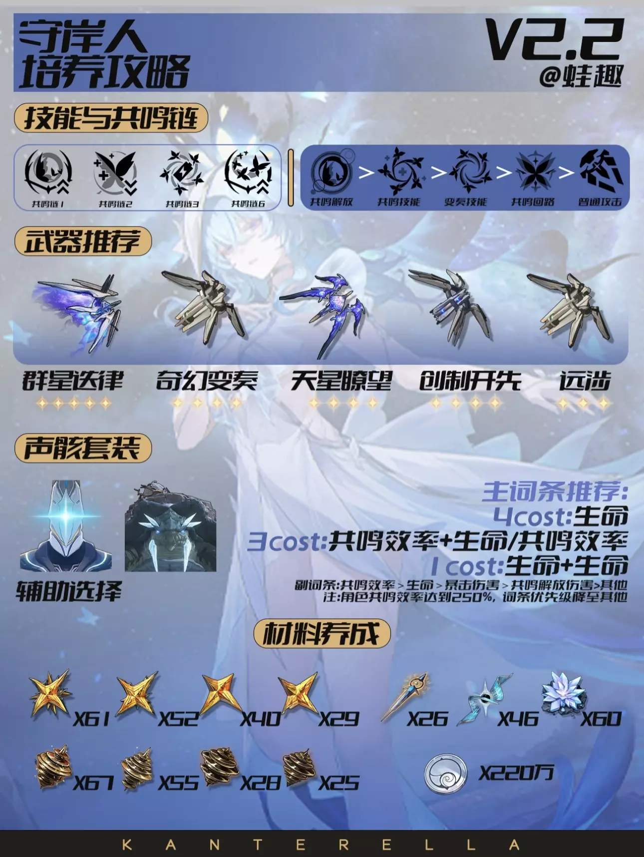 今天给大家带来的是守岸人的一图流培养攻略~ 图中包含了: 技能与共鸣链|武器推荐|声骸套装|主词条推荐|材料养成 守岸人衍射属性辅助,主要作为奶妈替换维里奈,也可主C。 #鸣潮 #踏上鸣日征程 #鸣潮攻略 #鸣潮守岸人 #鸣潮创作者激励计划
