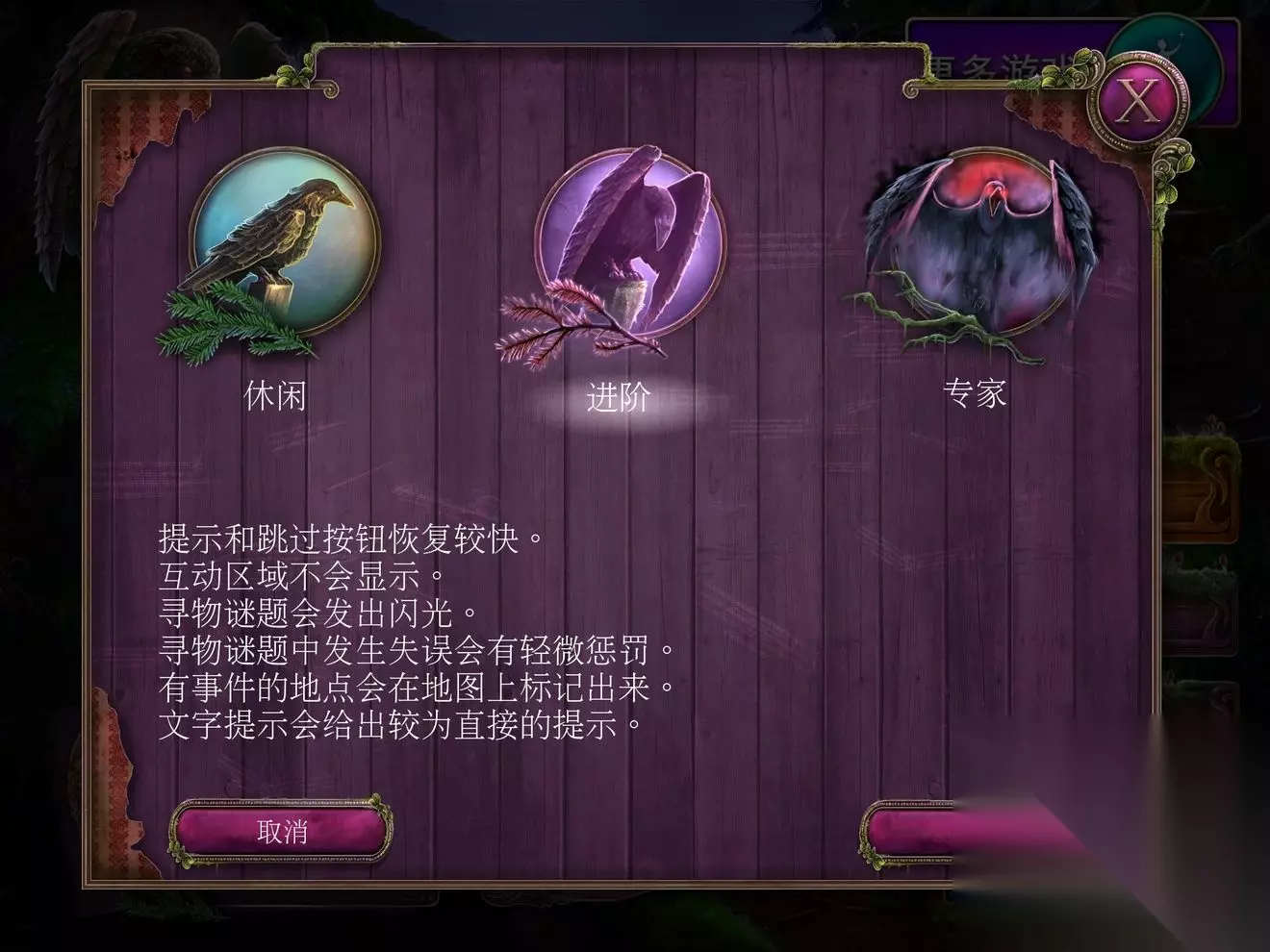 相较于第一部,第二部新增了一些找物模式,如给出物品形状找出来然后按要求获得最终物品,类似于一个小解密游戏了。更重要的是!! 新增了配对游戏!!如果实在不想找或者找不到可以通过配对游戏完成任务,终于把玩家从眼瞎中解放出来了!!泪流满面甚感欣慰 乌鸦森林之谜3:卡赫拉之影