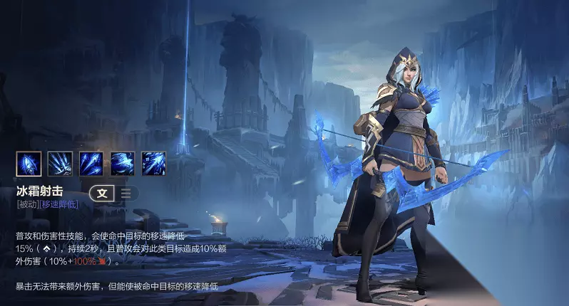 寒冰作为黏人和控制能力很强的消耗型射手,要玩好她一定先要了解她的技能技巧。首先寒冰的被动冰霜射击,寒冰的普攻会使敌人减速,敌人的周围会有冰霜效果。再就是一技能,一技能自带两层被动,每次普攻增加一层被动,最多六层。主动释放则会增加攻速,接下来的每次普攻将会连续射出四发箭矢,每次连续射出箭矢将会消耗一层被动,最多使用六次并附加减速。