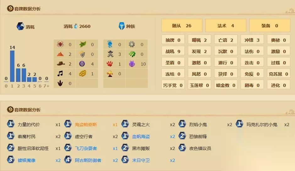 卡组解析 双血帆+帕奇斯: 之前试过双软,但是因为血帆赚攻击频率,以及拉帕奇斯有奇效,因此使用了现在的配置。我的看法是,如果你目前用的卡组2费曲线太高,都可以适当放软,不管是什么职业。现在这个版本,前4费占场太重要,4费前有场面,意味着你下奥金斧/蓝龙/阿古斯/芬姐才有场面支持。举个例子,对于龙牧这种大型动物园,但是1、2要看发牌员心情的卡组,带上两个软值得一试,还能减少334被迫裸下的概率。 双阿古斯无魔瘾: 同样4费,仅从提供属性而言,454和423配两个+1/+1本来就持平,多BUFF一个都是魔瘾赚,但问题是现在环境的老大是海盗战,增加场面的厚度不如增加场面的“硬度”。海盗战3费后场面优势会慢慢消逝,但是这个时候的海盗战靠着无数的直伤能斩杀血量不满(对,不满就危险!)的敌人,而这时候一个阿古斯可以救命,这是魔瘾做不到的。 双魂火单历代:魂火是刷牌引擎,而且可以过墙,考虑弃牌再抽回来,就等于3费扣2血打4,可以接受,不要一味纠结弃魔像。弃牌术的场面不如传统动物园,历代有可能卡手,我后面就改成了只带一张。 2费曲线选择: 飞刀恐狼站不住,而且更 适合后入,各留一个灵活用。恶魔之火非常关键,一个是一费上113二费恶魔之火的小朋友就变成了小斧子/闪电箭/横扫吃不掉的小怪物,而且可以吃蓝海船长/穴居人等,补充3费攻击曲线。双血帆后只搭一个小软,2费唯一满编的是最灵活的李奶奶。 总而言之,曲线往低压,尽早用光手牌定向弃魔像,中期抽一张及时的大哥或者阿古斯是胜利的关键(脑补游戏王经典场景有助神抽)。