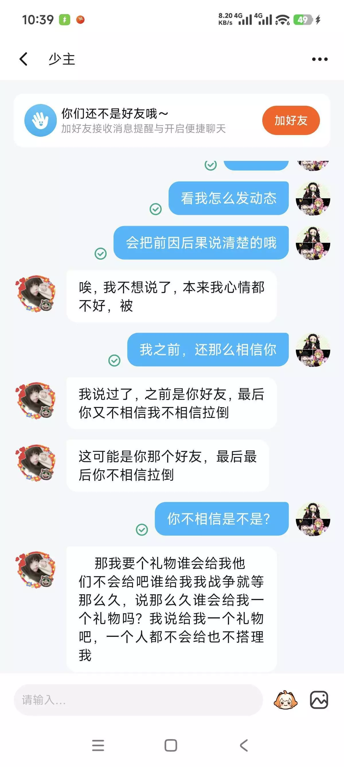 我的妈呀,这个人啊,之前我很她聊天,她说什么不想活了,我还时分相信她,结果我改名字了后,她就翻脸不认人了,一直说我是冒充者,我之前叫猫猫