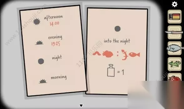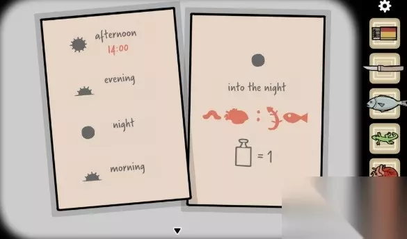 将沙子装进花盆,把向日葵栽进去。 之后拖动太阳,让向日葵完全神展开。之后拖动太阳,控制花盆倾倒。一颗葵花籽从向日葵上掉落下来,正好可以用瓜子来贿赂那只小松鼠。 将天平挂在镜子旁的挂钩上。利用砝码质量为1这条信息,计算各个物体重量。 经过多次实验后得到信息: “虫子质量为0 壁虎质量为1 火柴质量为2 刀子质量为3 心脏质量为4 咸鱼质量为5” 结合之前纸条上的迷题,我们得到时间04:15。 时间来到晚上,四周一片漆黑。 一直猫头鹰站在枝头,我们赶走它。同时我们发现月亮上有条缝隙,我们用刀子割开。