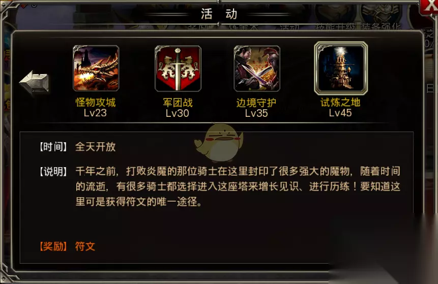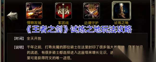王者之剑试炼之地玩法攻略 一、开启条件: 玩家角色达到45级并完成相关主线任务时,开启活动中的试炼之地。