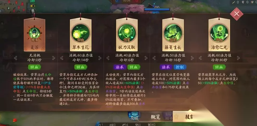 莹草的技能都是和回血相关的,被动也是强化回复能力。在她为一个血量不到一半的队友进行治疗时,能获得额外的血量恢复,数值会根据最大生命值以及等级提升。这个被动强化了莹草救助残血的效果,能更好地保护队友。只不过被动对同一个单位会有八秒的冷却限制,避免对残血一直奶很多血导致强度太高。莹草的1技能是她的主要回复技能,指定一个单位之后就能为他施加回血buff。除了基础的回血量外,拥有buff的队友在进行普攻或者受到攻击之后就会让回血效果传递给其他队友,这样对线的强度会更高。而且团战的时候收益也很不错,只不过最多能传两次。这个技能还能给莹草自己使用,挂上之后再用其他技能造成伤害也能触发绽放回血。