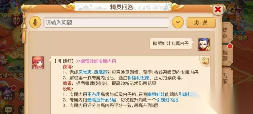 获取幽莹娃娃的途径 1.通过活动获得 在梦幻西游中,游戏官方会定期推出各类活动,幽莹娃娃往往是活动奖励之一。玩家们需要密切关注游戏内的公告,参加相应的活动,完成活动任务,最终便有机会获得幽莹娃娃。 2.商店购买 幽莹娃娃作为游戏内可交易的道具,玩家可以在游戏内的商店系统中寻找其他玩家上架的幽莹娃娃进行购买。这种途径需要玩家有一定的游戏内货币或通过充值获得的道具来交换。 3.礼包兑换 在某些特殊节日或游戏周年庆时,官方可能会推出含有幽莹娃娃的礼包,玩家可以通过购买礼包的方式获得。这类礼包通常具有一定的限定性,因此需要玩家把握时机。 4.完成成就任务 游戏内某些成就或任务完成后,玩家可以获得幽莹娃娃作为奖励。这类获取方式通常需要玩家拥有一定的游戏等级和完成任务的能力。