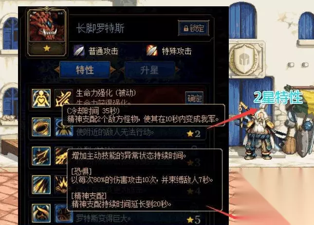 前排卡牌选择: 长脚罗特斯,该卡不仅拥有强大的基础属性,生命和防御都可以满足前排的需求,而且在作为坦克的时候技能方面的表现也非常的有一。其中“精神控制”技能,可以在一定的时间内操控敌人作为自己的手下,从而让敌方成为自己的助力,间接的削弱敌方的战斗能力。