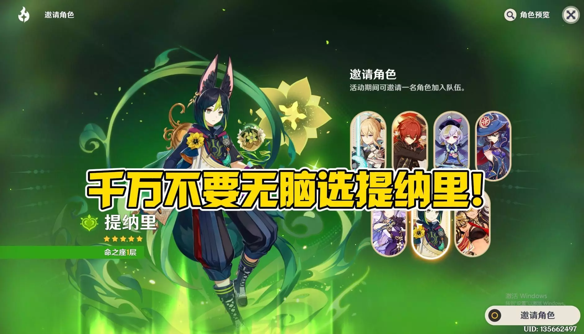 这是原神相关游戏视频,针对卡池歪出常驻五星的情况,讲解常驻五星角色玩法,比如提纳里在须弥打怪探索很实用,迪卢克也有一战之力,帮玩家用好这些常驻五星角色。