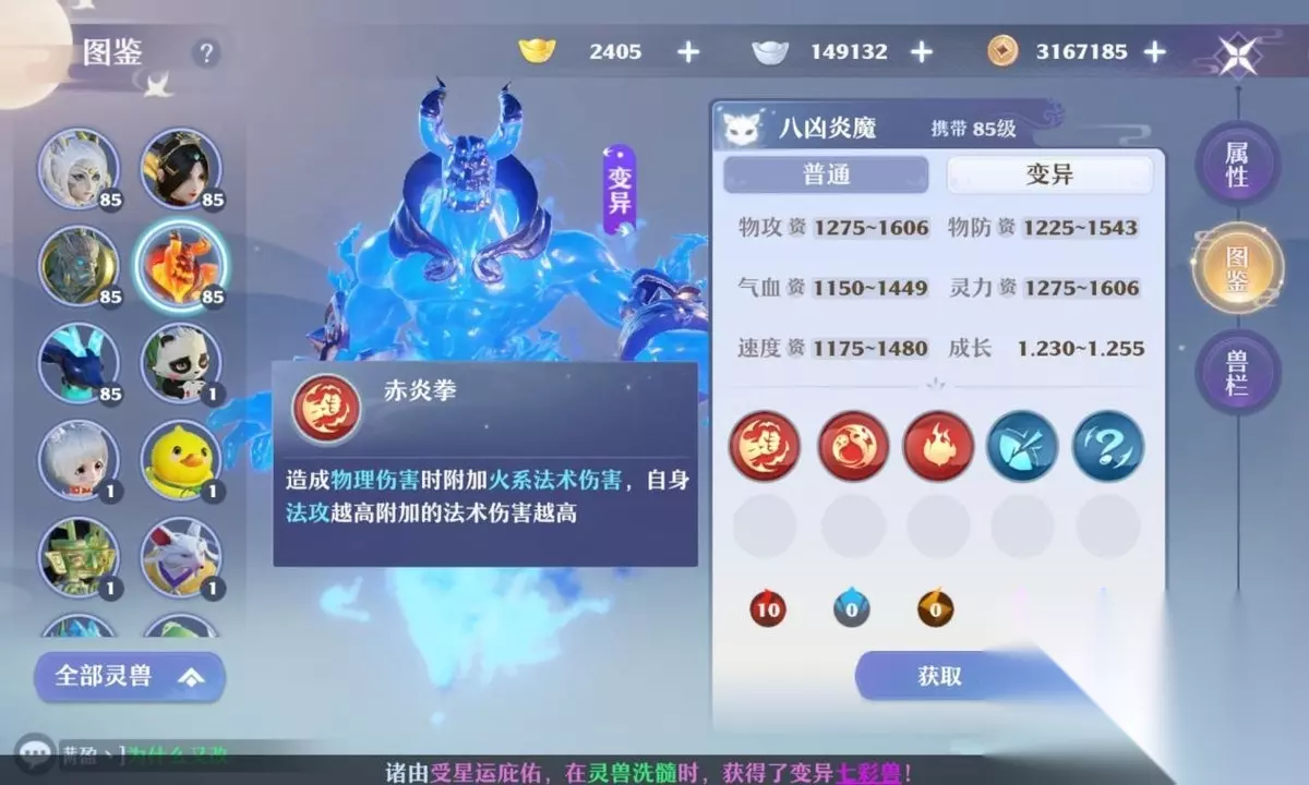 赤炎拳+高级连击+高级火元素+高级物穿+高级火系亲和+高级重生+高级健壮 选择连击搭配元素亲和,来打造更稳定的暴力输出思路,同时健壮加重生也拥有一定的保命能力。物穿也可以换成物暴,对于运气好的玩家来说收益较大(比较看脸)。 如果只洗出四技能的话,可以考虑将物穿或者火系亲和舍弃掉。 八凶炎魔加点推荐: 剑气流: 推荐7力3体或8力2体加点,输出和生存能力并存,不管在PVP还是PVE中都可以站得住脚。 连击流: 推荐7力3体或8力2体加点,适当补充一点生存能力,主要还是用来打输出。 八凶炎魔对战思路: 八凶炎魔作为85级灵兽,培养起来还是很强的,不管是PVP还是PVE中可以作为首发出场。如果有固定队的小伙伴,可以考虑每个人做一只剑气火人,然后PVP的时候首发五只剑气火人也是相当有牌面的。 不过五技能还是太难洗了,如果实在吸不出来的小伙伴也不要上头,选择四技能并不会比五技能差太多,如果上头反而容易破产。
