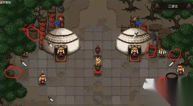 回到大地图后,去往下方的江陵渡口,这个渡口会触发一个支线,这里选什么都行,玩家在渡口处可以先去粉衣服歌姬所在的船,这里能得到一本书,右上角的闯能拿到馒头,接着进入酒楼内会发生战斗,赢得战斗后能得到若干武学,同时上官楠也会入队,走过渡口后先到金军营地,进入营地会有对话,选第三个机智即可,营地内最右边的一个人会让喝汤,喝两次能提高我们的气血上限,但第三次就不要了。