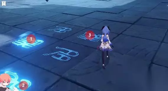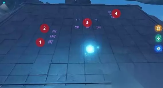 进入紫色关卡以后,脚踩图中标记的文字。(左侧两边2、中间正中央1、右侧中间1)
