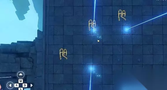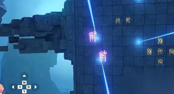 击败本关的敌人后,会出现光束机关,操作和上面紫色一致,利用光束激活平台的文字。