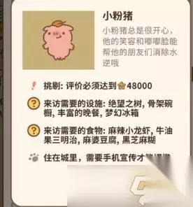 4、小粉猪 来访需要的设施:绝望之树、骨架碗厨、丰富的晚餐、梦幻冰箱 来访需要的食物:麻辣小龙虾,牛油果三明治,麻婆豆腐和黑芝麻糊 住在城里,需要收集宣传才能招揽。
