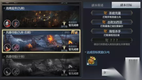 以上三个任务完成后,剩下的任务挂机自动打完,即可领取本层的成就称号【驱散黑暗】啦 多人副本:9转·后:风暴夺船 一开始会显示前3个任务内容 这三个任务内容只需要挂机打完就会完成 接下来一起看看需要手动完成的任务