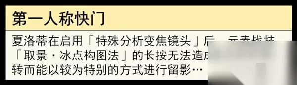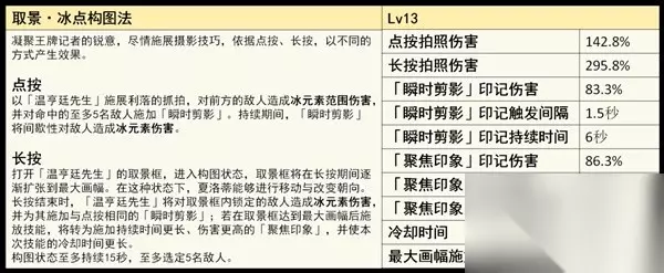 点按 对前方的敌人造成冰元素范围伤害,并对命中的敌人施加「瞬时剪影」。 ·「瞬时剪影」效果:间歇性冰元素伤害。长按 进入构图状态,长按期间逐渐扩张到最大画幅。能够进行移动与改变朝向。 长按结束时,将对取景框内锁定的敌人造成冰元素伤害,并为其施加与点按持续伤害; 最大画施放技能持续时间更长、伤害更高,技能的冷却时间更长,最多持*15*。 (必须在框内才能生效。) (最多5名敌人生效。)Q技能