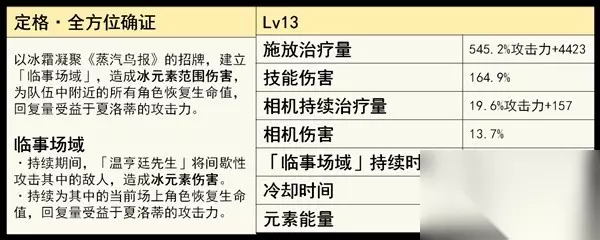 先造成一段冰范围伤,和高额奶量,再留下一个生效4次的领域。 领域: ·持续造成冰元素伤害。 ·持续为我方回血。特殊天赋