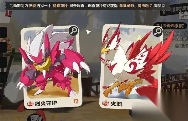 与稀兽花种再次进行交互,就可进入战斗。本场的主要敌人是火羽,可上阵水系的精灵来进行克制,将它打败后就能进行捕捉,拿到烈钻鸟。在精灵调查持续期间,各位重复多次地来稀兽花种这里捕捉烈钻鸟,没有任何的捕捉上限。当仓库里的烈钻鸟数量足够多时,各位还能得到烈钻鸟的信任,并获得它给予的种子。此种子有着十分独特的花纹样式,放在庇护所里可在世界里唤出烈钻鸟来进行捕捉,如果一同玩的伙伴没有烈钻鸟,而玩家刚好有种子时,可通过使用种子召出烈钻鸟的方式,来令伙伴拿到烈钻鸟,不用等精灵调查开启。