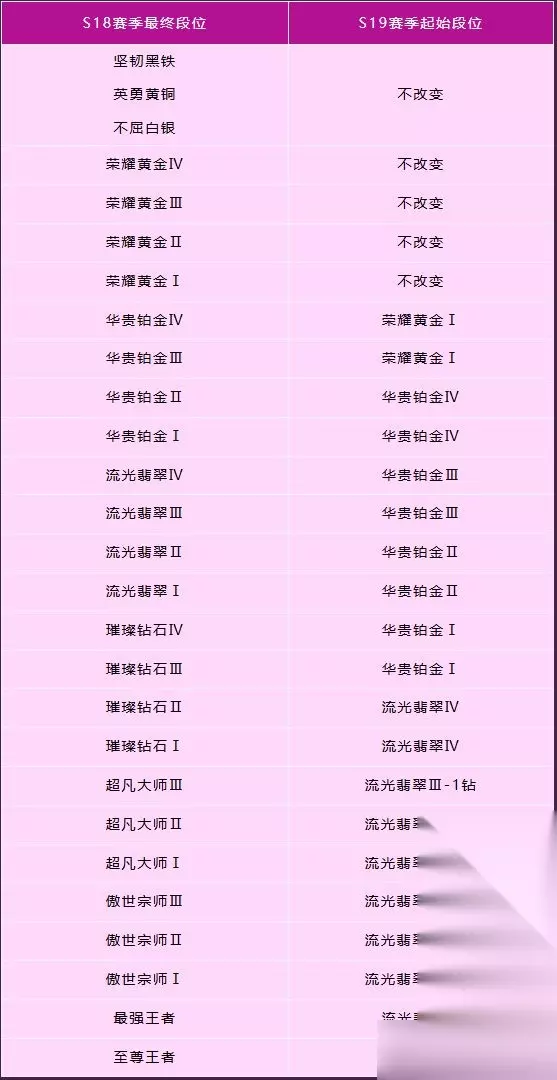 排位赛赛季奖励赛季结束时,各位召唤师还将根据赛季期间达到过的最高段位来获得相应的队旗奖励。 其他赛季末附注各位召唤师还需要注意的是,在赛季结束后,海克斯能量和海克斯护盾都会清零。召唤师们把握好机会好好运用,也祝各位召唤师在新的赛季取得理想的成绩!时间不等人,快抓紧机会上号、排位、疯狂上分!峡谷之巅等阶重置S18峡谷之巅的等阶也将进行重置,详情如下: