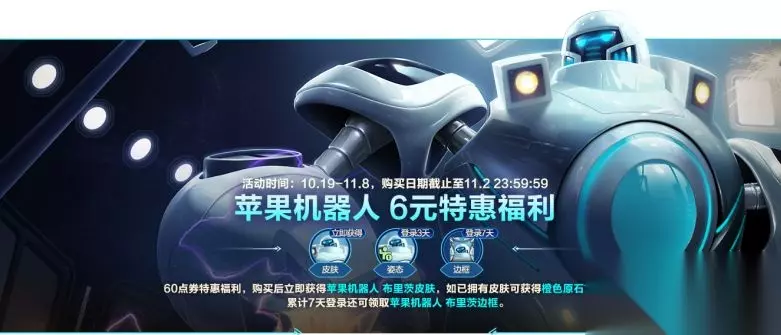10月6元小额理财10月6元特惠福利即将来袭~10月19日起,召唤师使用60点券购买小额理财,即可获得苹果机器人 布里茨皮肤,如已拥有皮肤可获得橙色原石*30,累计登录7天还可领取苹果机器人 布里茨首发皮肤边框!