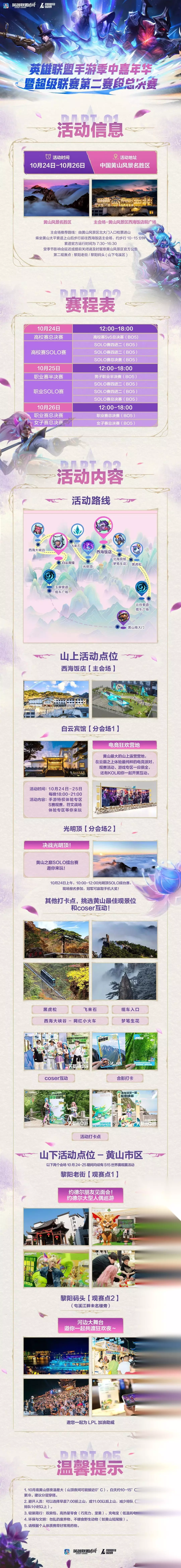 季中嘉年华召唤师集结!这里有一份《英雄联盟手游》季中嘉年华暨超级联赛第二赛段总决赛活动详情请查收!高燃赛事,趣味活动,尽在黄山,一起来看看吧~活动信息时间:10月24日-10月26日地点:中国黄山风景名胜区活动内容山上活动点位:高燃电竞狂欢派对空降黄山!多个山上活动点位已就位,更有COSER团前来助阵,互动打卡少不了。 山下活动点位:来黎阳老街参加约德尔朋友见面会,邂逅约德尔人!黎阳码头还有绝美河边大舞台,邀你一起燃爆嘉年华狂欢夜~嘉年华现在好玩又好看,提前规划,准时出发!上下滑动下方长图,查看更多活动详情,隆哥在黄山等你~