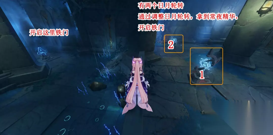 解密如下图: (1)先到【日月轮1】处,调整到白夜状态,蓝色屏障消失,然后来到【日月轮2】处。 (2)在【日月轮2】处,调整到常夜状态,左边的里面的密室机关呈现, (3)进去激活密室机关,右边的密室铁门打开,回到【日月轮2】处, (4)在【日月轮2】处,调整到白夜状态,蓝色屏障消失,再回到【日月轮1】处。 (5)在【日月轮1】处,调整到常夜状态,这时即可进去密室拿常夜精华了。