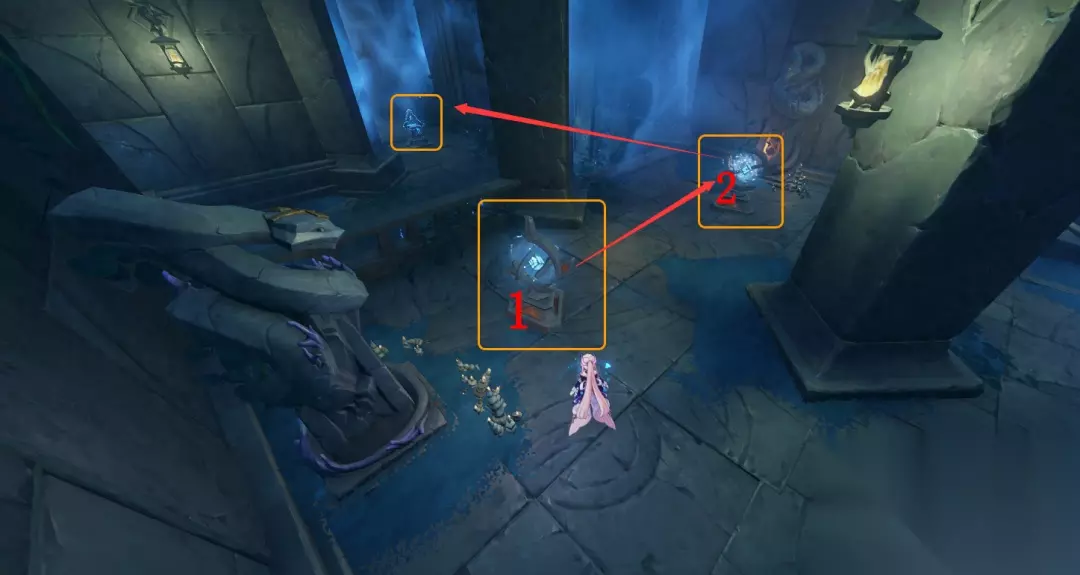 拿到常夜精华后,如下图 (6)到【日月轮1】处,调整到白夜状态,蓝色屏障消失,然后从【日月轮2】处拐下去,点亮下面的三角机关,攻击三角机关开启铁门。