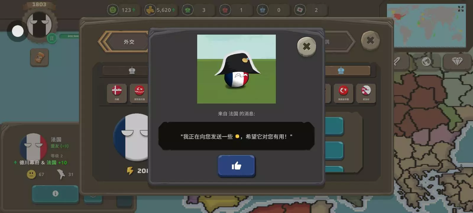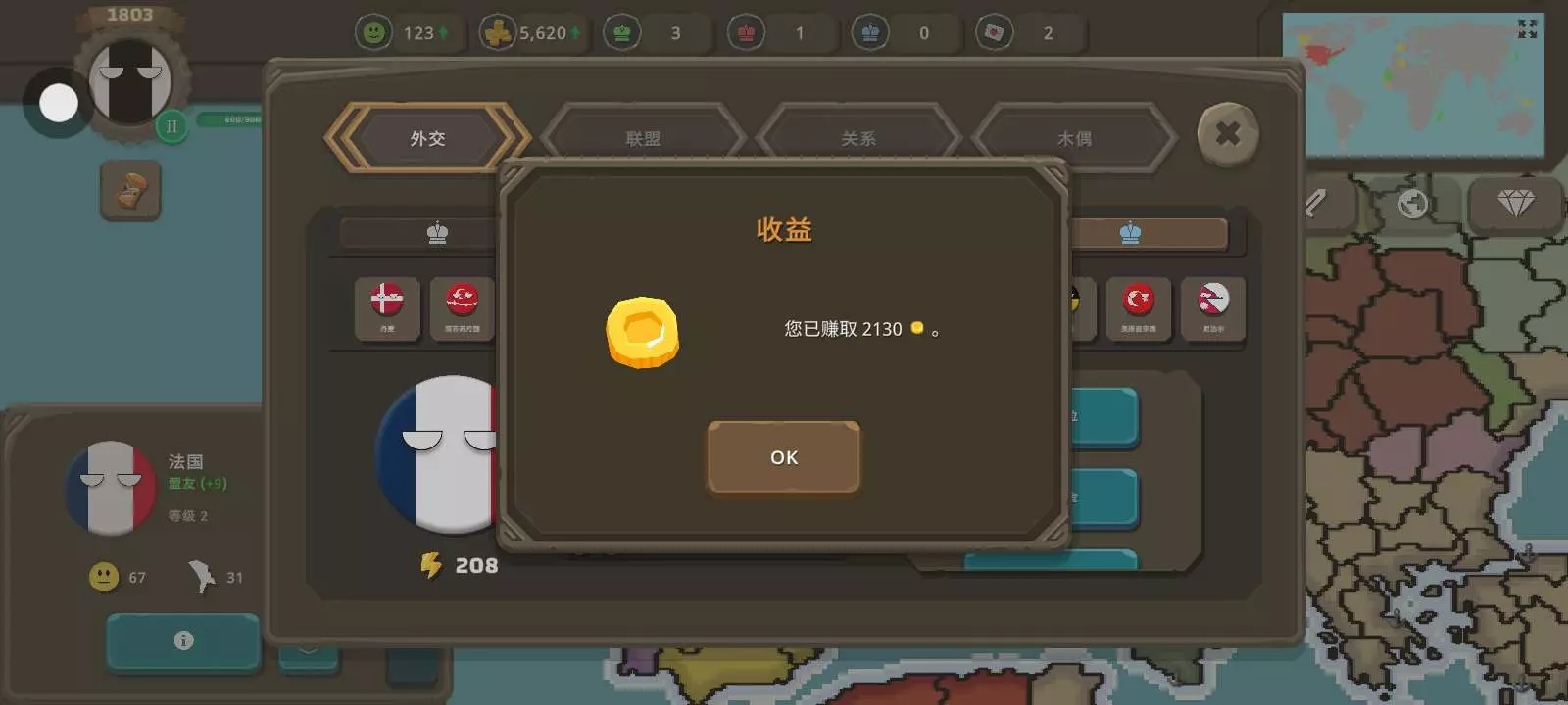 现在很多人都不知道如何让盟友给你钱,就在那个拿破仑战争中,你开局在法国不是很强的时候,跟他成为盟友,然后在他那远征的那回合找他要钱,100%给2000多,他都可以给你