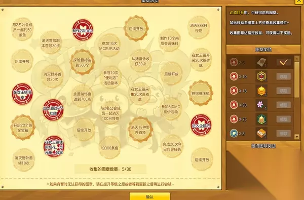 注意事项: 1.打开集章活动界面后,将鼠标移动至图章上即可查看该图章目标的具体要求。 2.同一账号下所有角色共享集章进度。 3.如果有暂时无法获得的图章,请在提升等级之后或者等到更新之后再进行尝试。 4.共有30个图章供冒险家们挑战。 图章任务汇总: (尚有部分图章目标需等待更新) 与2名公会成员一起钓50条鱼: 必须以自由身与2名公会成员组成的3人组队的形式来进行。 只有与组队的公会成员一道在相同区域进行该任务,才会得到承认。 消灭冒险副本首领30次: 懒惰的树妖、菲尔卡罗、影子术士德布拉克、混沌巴风特、马克52贝塔、帕普拉图斯、可怕的克洛洛、遗忘石巨人等。生命裂隙、勇气考场副本除外。 消灭野外首领10次/20次: 蛙王、巨型海龟、巨角怪战士、格里芬、马克52阿尔法、格里菲娜、洛洛和姆姆斯、石巨人守门人、阿尔法乌龟、雷尔诺斯、愤怒的巴风特、托托和古古斯、菲卡诺斯、冷血巴风特、冰炎龙兽、阿玛顿、咒术师乌斯、亚克雷文等。 在女王镇演奏 在野外寻找并开启20个黄金宝箱 加入社团并拥有2个以上的社团 在女王镇使用烟花、荧光棒、鼓掌。 探险目标达到500个 房屋装饰度达到700点 参加5次/10次MC凯伊活动: MC凯伊活动课在每小时05分、35分参与。 参与10次“便利店”活动副本。 与2名公会成员一起消灭100只怪物: 必须以自由身与2名公会成员组成的3人组队的形式来进行。 只有与组队的公会成员一道在相同区域进行该任务,才会得到承认。 通过钓鱼获得300条鱼。 从设置于自身房屋内的猪畜舍收获30次猪尾巴。 在女王镇薰衣草中采集30次薰衣草。 消灭18种野外首领: 蛙王、巨型海龟、巨角怪战士、格里芬、马克52阿尔法、格里菲娜、洛洛和姆姆斯、石巨人守门人、阿尔法乌龟、雷尔诺斯、愤怒的巴风特、托托和古古斯、菲卡诺斯、冷血巴风特、冰炎龙兽、阿玛顿、咒术师乌斯、亚克雷文等。 制作10个南瓜香调味料。 完成20次近日向导任务。 消灭888只怪物。 在女王镇开采30次锡矿脉。 获得纸飞机。 进入企鹅吧。 图章收集奖励汇总: 集齐5个图章可获得:会员3天体验券 集齐10个图章可获得:枫叶名牌徽章30天 集齐15个图章可获得:漂浮小黄鸭气球(飞行坐骑) 集齐20个图章可获得:纷飞花瓣(脸饰) 集齐25个图章可获得:M飞船(飞行坐骑) 集齐2个蘑菇图章可获得:蘑菇图章礼包 集齐5个蘑菇图章可获得:鸭力黄包车 最终图章奖励: 真正的冒险家礼包(内含:闪耀黄金武器箱、表情动作:黄金龙床、月饼腰带) 看了上文233乐园小编带来的《冒险岛2》不限号集章活动玩法攻略,你是否了解了相关内容信息,知道了呢!更多最新最好玩的手机游戏就来233乐园下载吧!