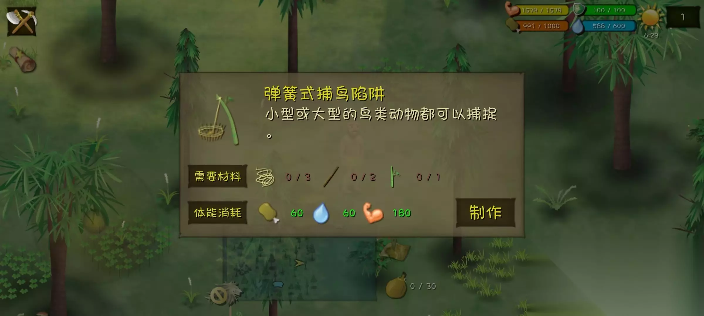 荒野一家地图的特点是资源分布非常均匀,但是每个资源点的物资都比较少。因为在这里地图中加入我们的妻子和儿子,所以食物的消耗是很快的,所以在游戏的开局,就要制作大量的陷阱来获取食物。 弹簧式捕鸟陷阱 弹簧式捕鸟陷阱是专门的抓鸟工具,可以用来抓所有的鸟类,包括有海鸟、乌鸦、囊鼠等。如果大家不是很熟练猎杀黄鼬,就可以用这个陷阱来抓小鸟,也是一个可以快速获得大量肉类的途径。