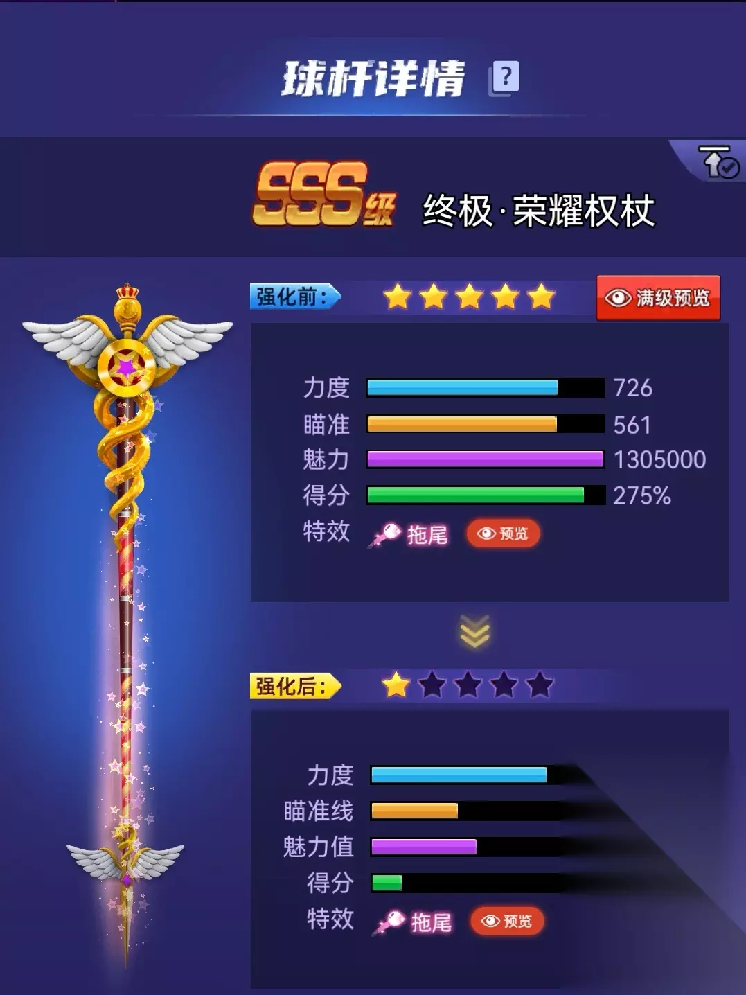 《天天台球》球杆图鉴:从桌前新手到台坛王者 “球杆是球手的灵魂,在绿色球桌上更是胜负手般的存在——用好杆,才能更自信地演绎‘一杆清台’的精准与荣耀。” —— 引自玩家“星落”的巡回赛冠军访谈 1️⃣荣耀权杖 球杆类型:经典款 满级属性: 力度726,瞄准561,魅力1305000 获取途径:俱乐部声望换购合成(白嫖)
