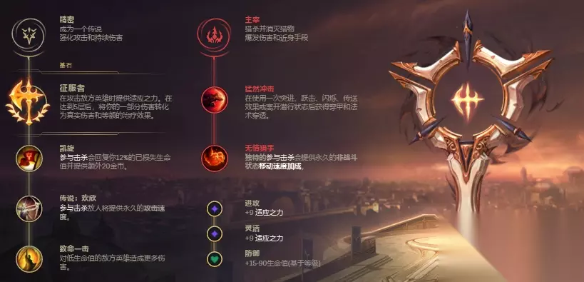前期装备可以出攻速鞋,无尽和电刀,Q技能暴击的高伤害在加上无尽的暴击增加伤害,对方脆皮基本上反应不过来就看黑白电视了,同时征服者和被动提供强大的回血轻松不会被敌人秒,后期补上肉装打团很,后期也可以做做复活甲和绿叉,加是德邦的E技能和W技能的减速效果,对手有位移技能也不容易跑。