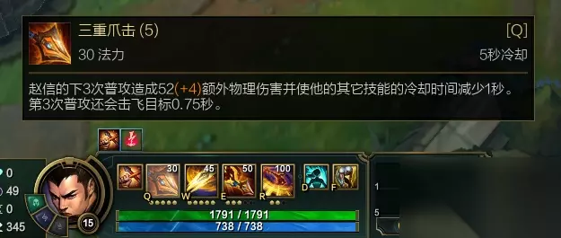 技能的话可以主E技能副W技能,德邦Q技能被动第三下可以击飞敌人,被动可以有额外伤害和回血,并且在之前版本中回血和Q技能都加强了,有了无尽的暴击加上电刀的攻速,可以极大的提升爆发,攻速装技能快速提升爆发。