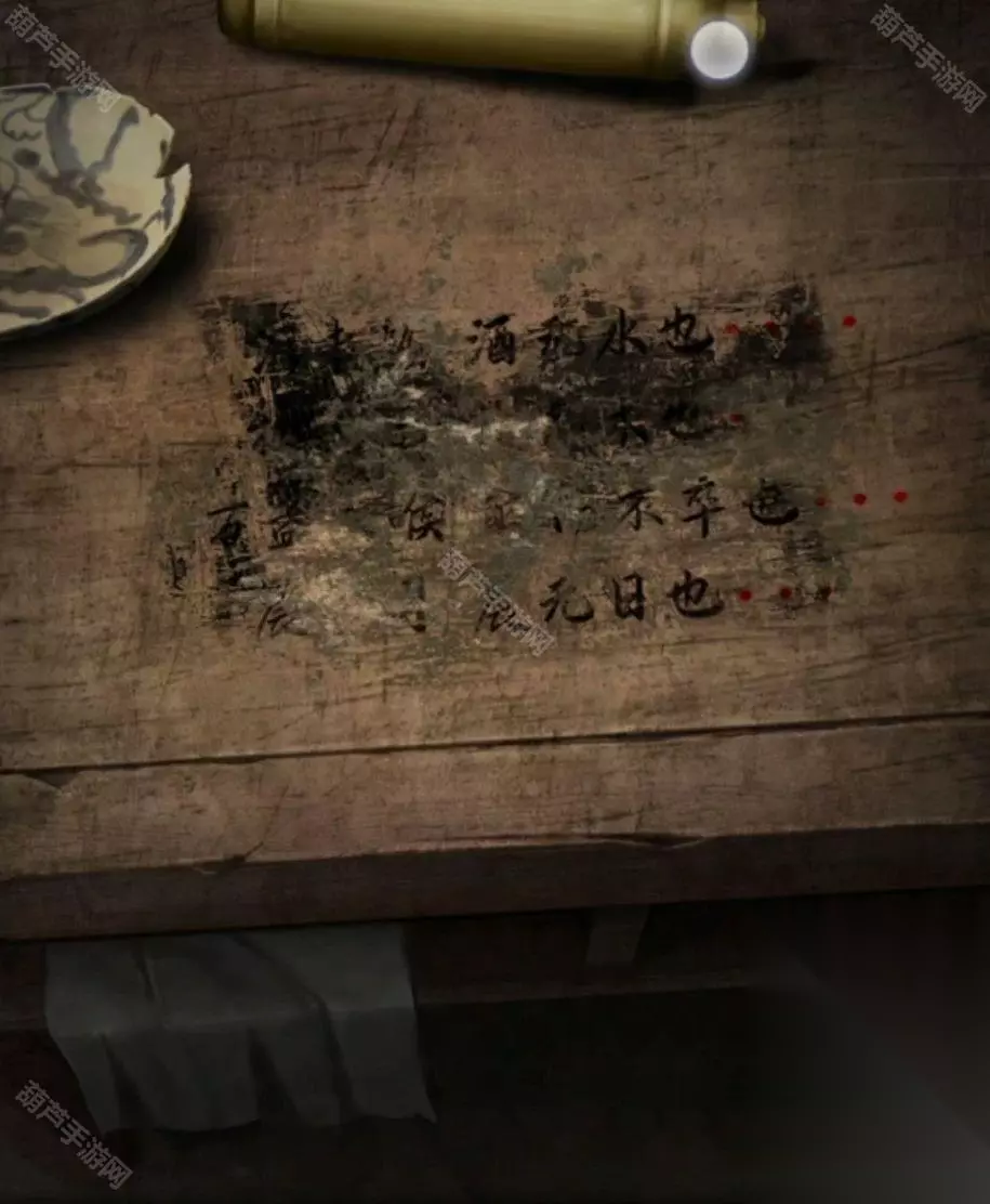 再次回到水井场景,使用水桶后又获得了一桶水,放心没有高能,只是上面出现了五个字,这个不用记的,因为一会要在这里用,后退两下再次回到厨房,对脸盆使用水桶,然后使用抹布获得湿抹布,对右边桌子的污渍使用湿抹布就获得了一行线索,右边红点肯定就是顺序了,谜题很简单1是卯、2是酉、3是辰、4是酉,看来是个生肖谜题了。