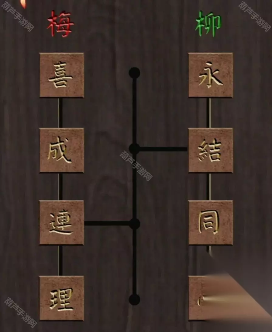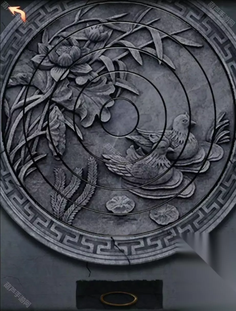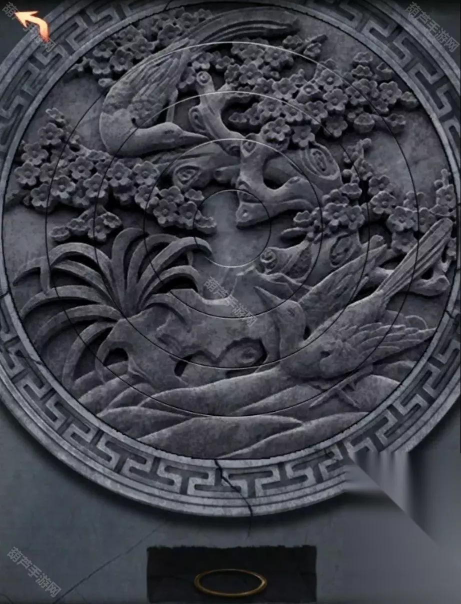 第五章图文攻略 首先注意一下门口对联,对联带数字或者颜色的大多数都是后面的线索,所以重点是绿永结同心,红喜成连理,查看一下左右的两张壁画,很简单的无联动旋转拼图,从中间往外转即可,左边是鸳鸯戏水图,右边是喜鹊连枝图,拼好后拿到两个圆环。