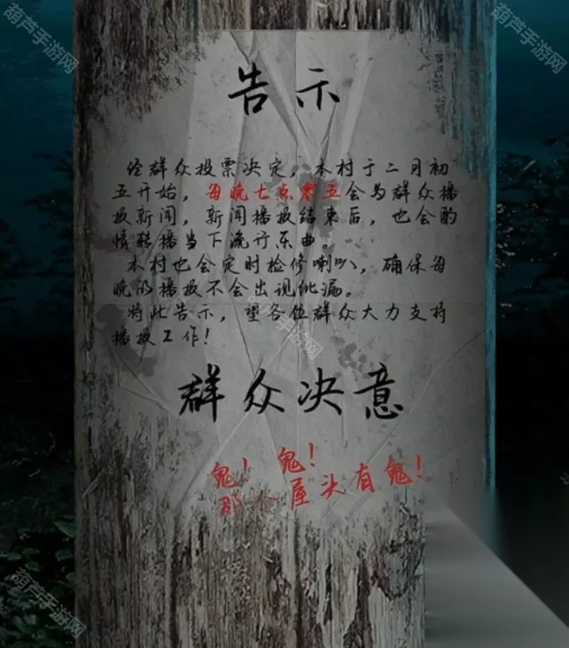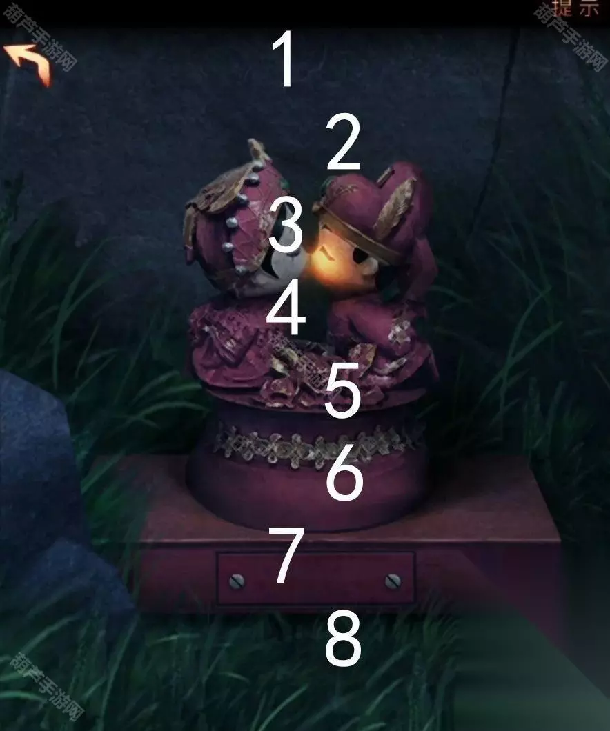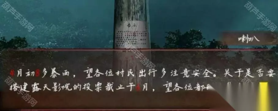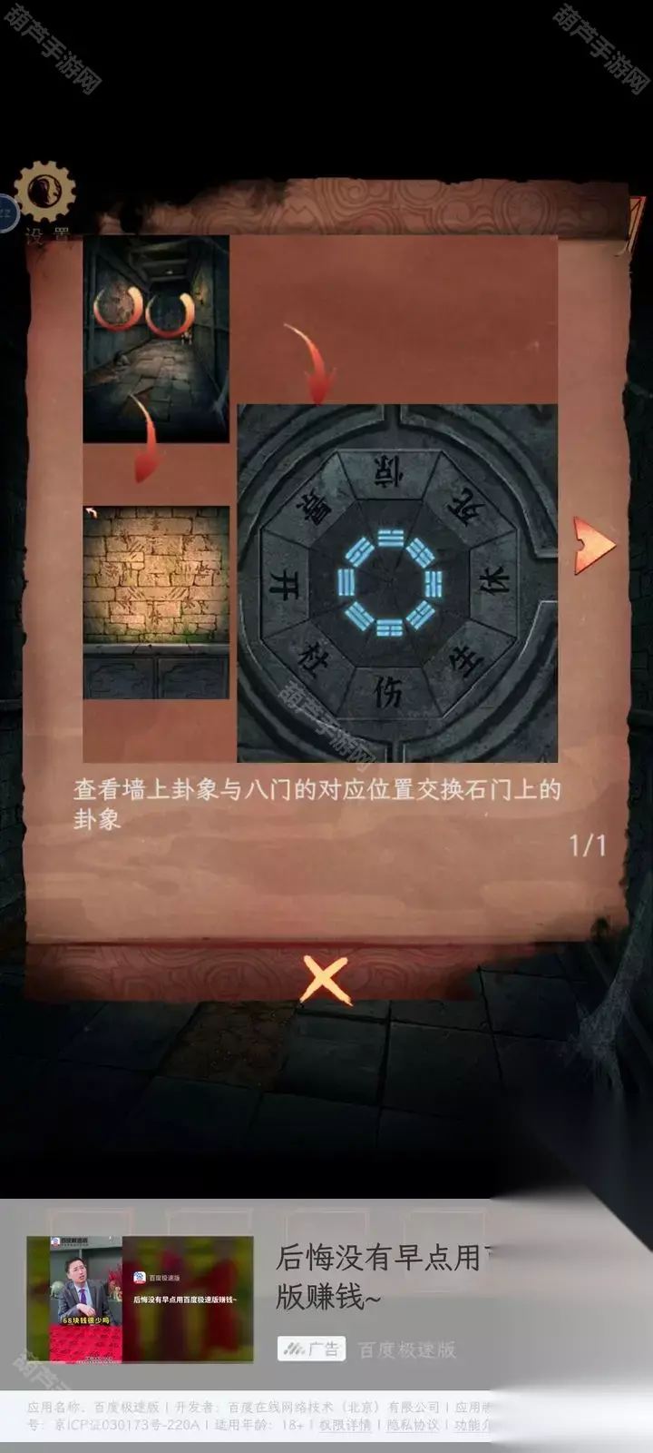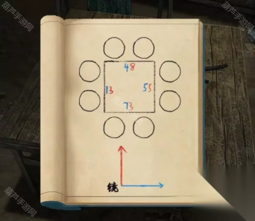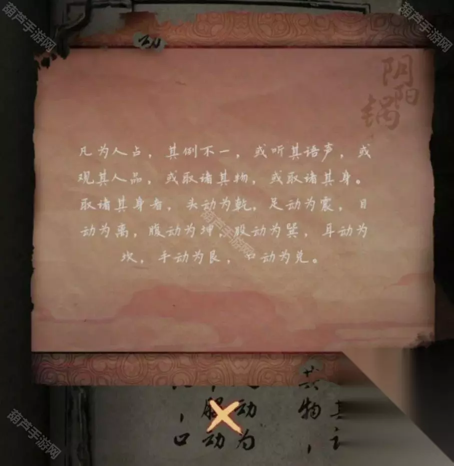 广播的内容就是线索,记下来红字48613这就是数字密码了,回到客厅查看右下角地上的密码箱,五位数字密码没错了,调整为48613后打开箱子拿到圆形镜子,查看左边的小锁后就看到纸条了,不过纸条上的提示没什么用因为我们乐器旁边有文字了。 回到卧室将圆镜子放在大镜子上触发剧情,剧情后镜子上出现文字,正对应上了之前的线索,既然是从左下角数,先蓝色再红色,那么上面48对应的字是槐,左边13对应的字是愁,下面73对应的字是眠,右边55所对应的字是思,记下来字和对应位置哦。 对墙上的年画娃娃使用鱼的画,之后年画自己脱落露出下面的机关,查看一下注意到是文字,我们现在获得的文字线索就是镜子上的了,上面的文字是槐,也就是木和鬼,正好也是左右结构;下面的文字是眠,拆分成目和民;左边的文字是愁,拆分成上下结构就是秋和心;右边的文字是思,拆分成上下结构是田和心,调整一下打开机关。 打开的机关内有个凹槽,使用那一半玉佩后就能自动放入男主身上的一半,看剧情本章结束啦~可惜没有,剧情过后拿到一个石像头,出门来到地窖口发现地窖门开了,这里没有任何提示哦!进入地窖后查看一下被小老鼠来回跑的红薯拿到一根棺材钉,对后面小神龛使用棺材钉露出无头神像,使用石像头后拿到一张线索纸。 看这个圆柱形的东西很眼熟,回到水缸查看一下水缸上面出现了文字,考虑到线索纸条上的文字没有重复且连续,优先考虑是顺序,那么按照数字顺序我们就可以获得密码边闷盍磨边闷平,也不用换地方就在水缸旁边演奏一下拿到一块幡。 剧情过后再次来到地窖,对左边墙上画门的左上角使用棺材钉,然后使用幡就出现了石门,进入石门后本章结束 第四章图文攻略 在地上捡起掉下的灯笼放到墙面的壁灯上,观察光通过灯笼投射在墙面上的投影小人指的八门,小人旁边的光点代表顺序,得到八门按压的线索。八门按下顺序为:伤惊死生开休。