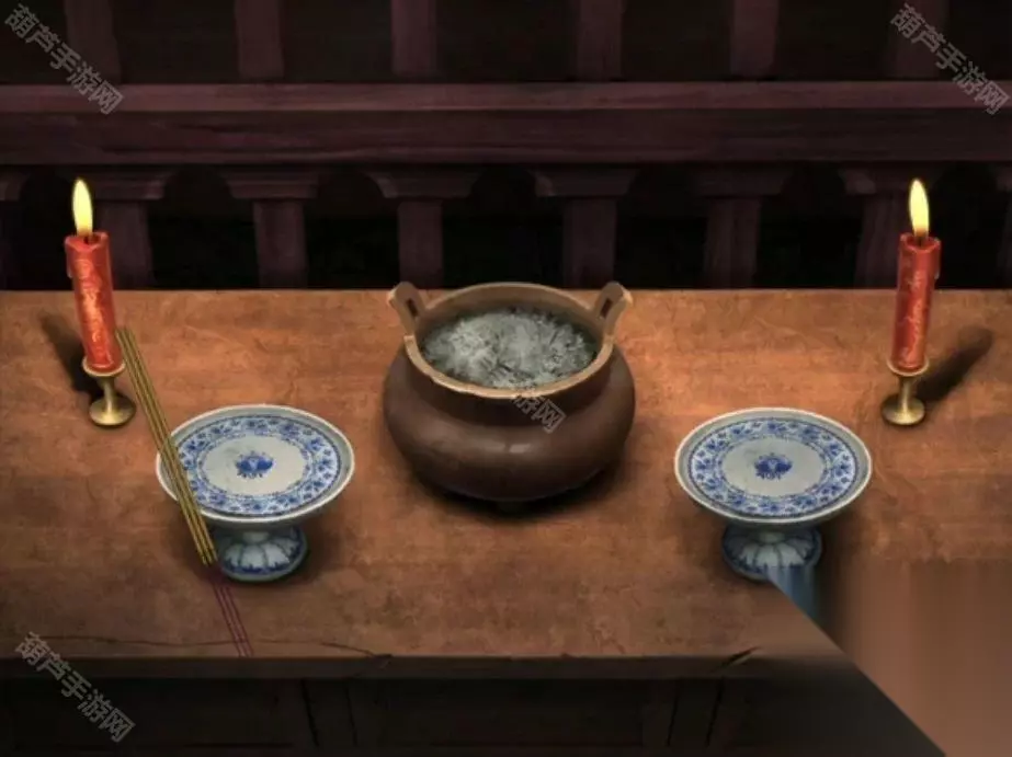 后退一下到小亭子场景,查看小亭子的窗口使用冥币获得线香,进入小亭子查看桌子上的蜡烛,使用蒲草后获得点燃的蜡烛草。再次进入小花园,对桌子上的茶壶底座使用木炭后使用点燃的蜡烛草,就获得了点燃的小香炉,然后对茶壶使用喜糖、蜂蜜、香囊,没错香囊竟然也是扔进去的!