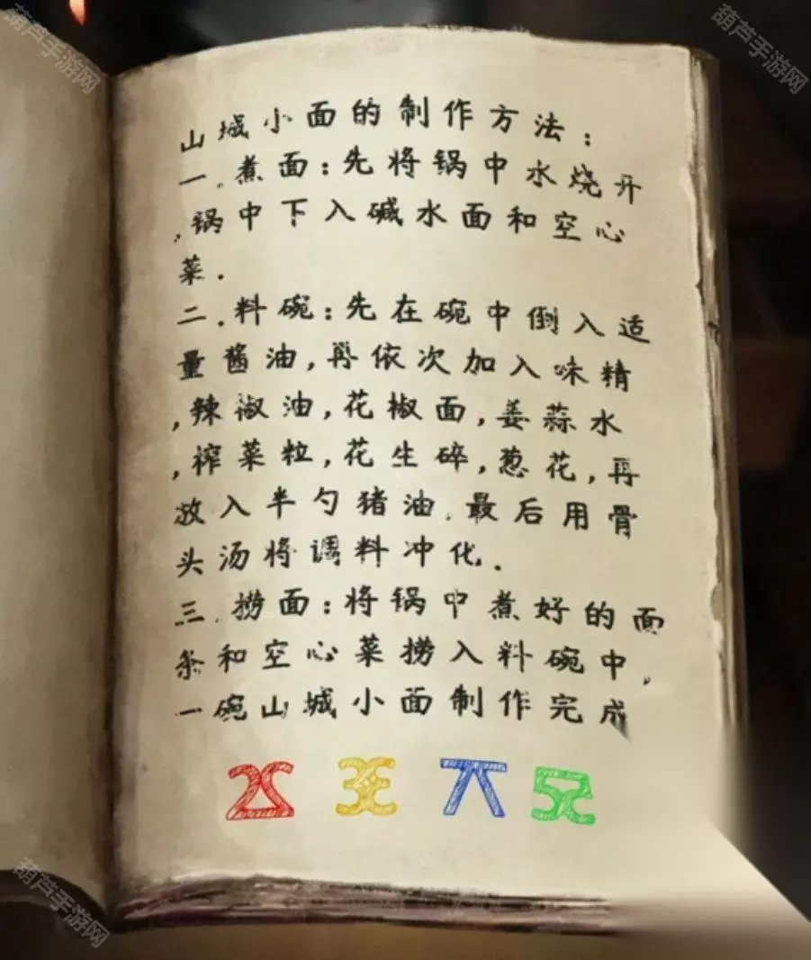 这本笔记本是可以翻页的,第二页有重点,注意一下料碗都需要什么,还有做面的顺序,最下面是四位数字密码,简单的镜像,红2黄3蓝7绿5,我们刚好有个颜色密码锁,所以密码锁的密码绿红黄蓝就是5237.