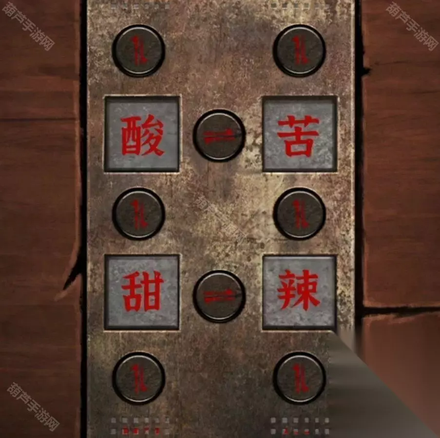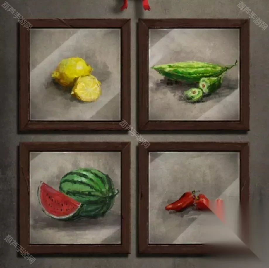 右边墙上贴着几张画,记下来左上柠檬,右上苦瓜,左下西瓜,右下辣椒,因为有西瓜所以应该不是颜色线索,味道线索的可能性大,也就是左上酸,右上苦,左下甜,右下辣。