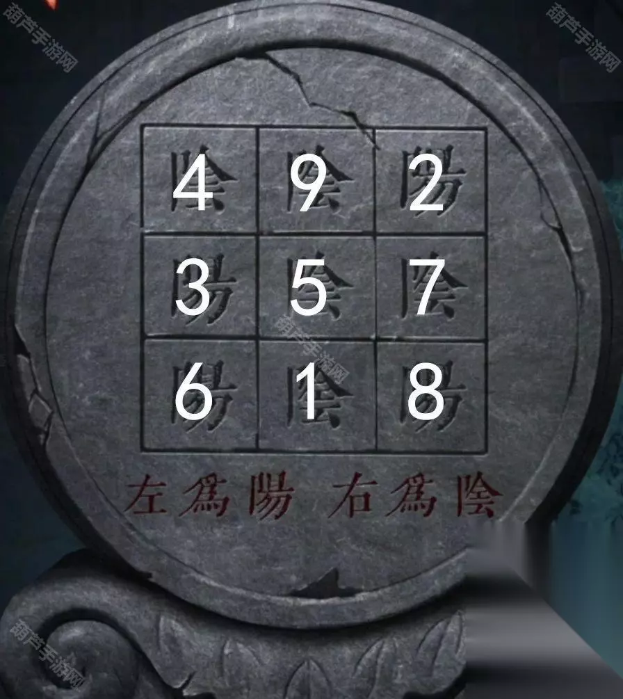 不过这里米雪就只写正确答案吧,答案如上图,既然是连续数字,那么按照数字顺序我们就获得了一串密码阴阳阳阴阴阳阴阳阴,还有个提示是左阳右阴,所以我们上面的密码就换成了右左左右右左右左右,将两个门环都放在门上后按照这个顺序敲门就可以开门了。