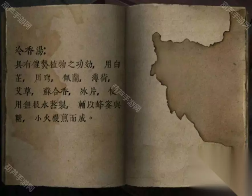 后面墙上挂着一把扇子,上面画了红花和绿草,所以那个密码纸上面还画了个箭头,我们可以先右边在左边从上到下,或者右左右左的顺序,有歧义依旧是穷举,这个顺序其实是先右边从上到下再左边从上到下的,所以密码是绿绿红红花花草草,按这个顺序点击一下扇子上的机关打开扇子,记下来图案是花-蝴蝶-鸟-鱼。 左边的柜子上拿到一套碗勺,柜子的机关需要一个能移动的物品,这种既需要文字又需要方向的就很麻烦了,查看一下右边椅子上的盒子,是个需要移动的机关,这个米雪不小心点到跳过了没有截图,打开盒子后拿到左边柜子的机关,查看书上是冷香汤的材料看一下。