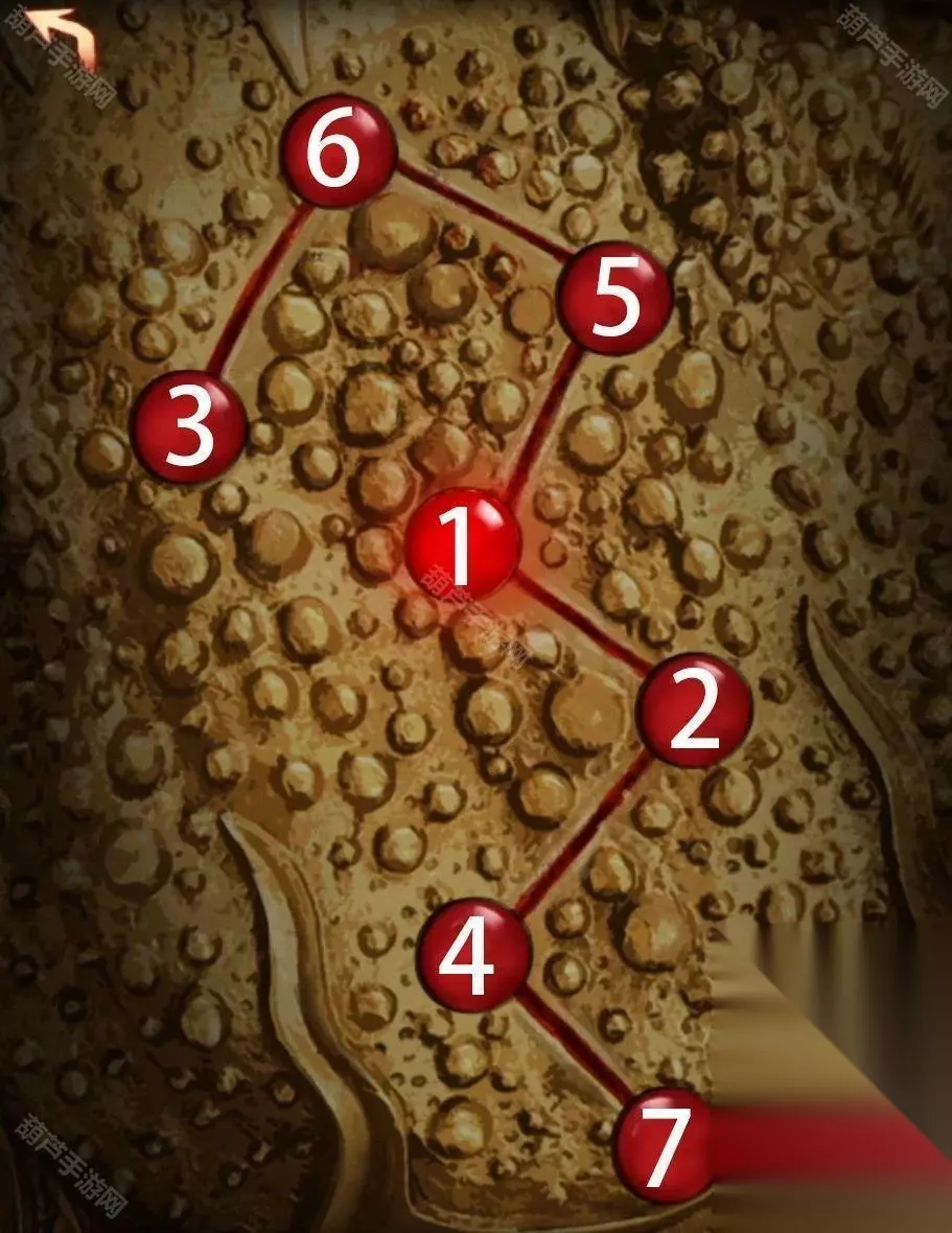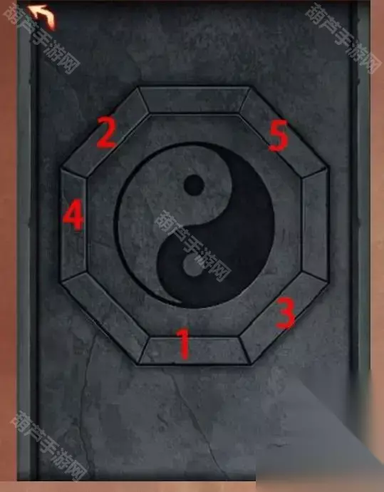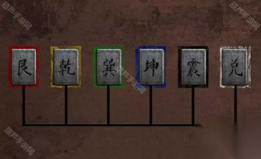 把收集到的玉石做的畜牲头从左到右按“猪牛羊”的顺序摆放三牲,就差铃铛了。 从书柜的书中拿到卦象图纸得到卦象与物象的对应关系,结合倒悬塔上卦象得到每层塔对应的物象,倒悬塔是倒着的所以要正过来看。根据线索调整到陶像的旁边每层塔上物象,答案从上到下的顺序,分别为:风水天山泽。拿到铃铛! 在香炉中插上线香对神像使用铜铃,触发剧情。 从香炉中拿到香灰,拿下镜子上的旧布,对铜镜使用香灰,触发VCR(剧情)。 在柜子中拿到纸条后,查看铜镜上面的卦象位置,结合纸条得到卦象按下顺序,根据线索按顺序按下石门机关,顺序如图所示: