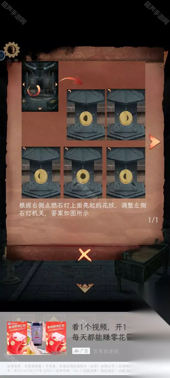 右边的石狮子暂时没有线索,查看一下右边的树发现会切换到树的角度,但是暂时没有其他线索,左转到小亭子房间,查看门上的符咒提示取不下来,右边的垃圾桶上面拿到锡箔纸,门旁边的灯挂着郎情妾意两个挂牌,看一下前面的小人偶玩具,左边是新娘也就是妾意,也就是说小人偶的左右需要互换点击,顺序就是右左右右左左右左,完成后灯亮起,拿到一枚铜钱。