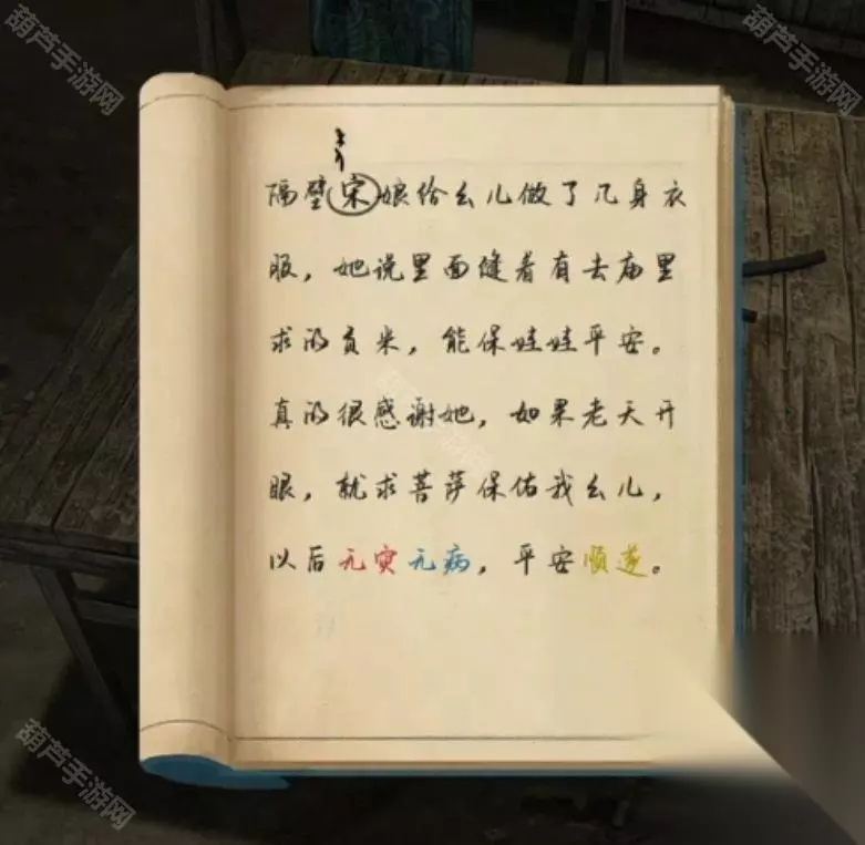 查看一下桌子上的笔记本,第二页有红色的无灾,蓝色的无病,黄色的顺遂,都记下来,宋的旁边还有个奇怪的鬼画符,第三页也有重点,不过需要更多线索我们先记下来后面再详细说。笔记本的旁边拿到一根炭笔,左边的柜子最上面拿到一只布老虎。