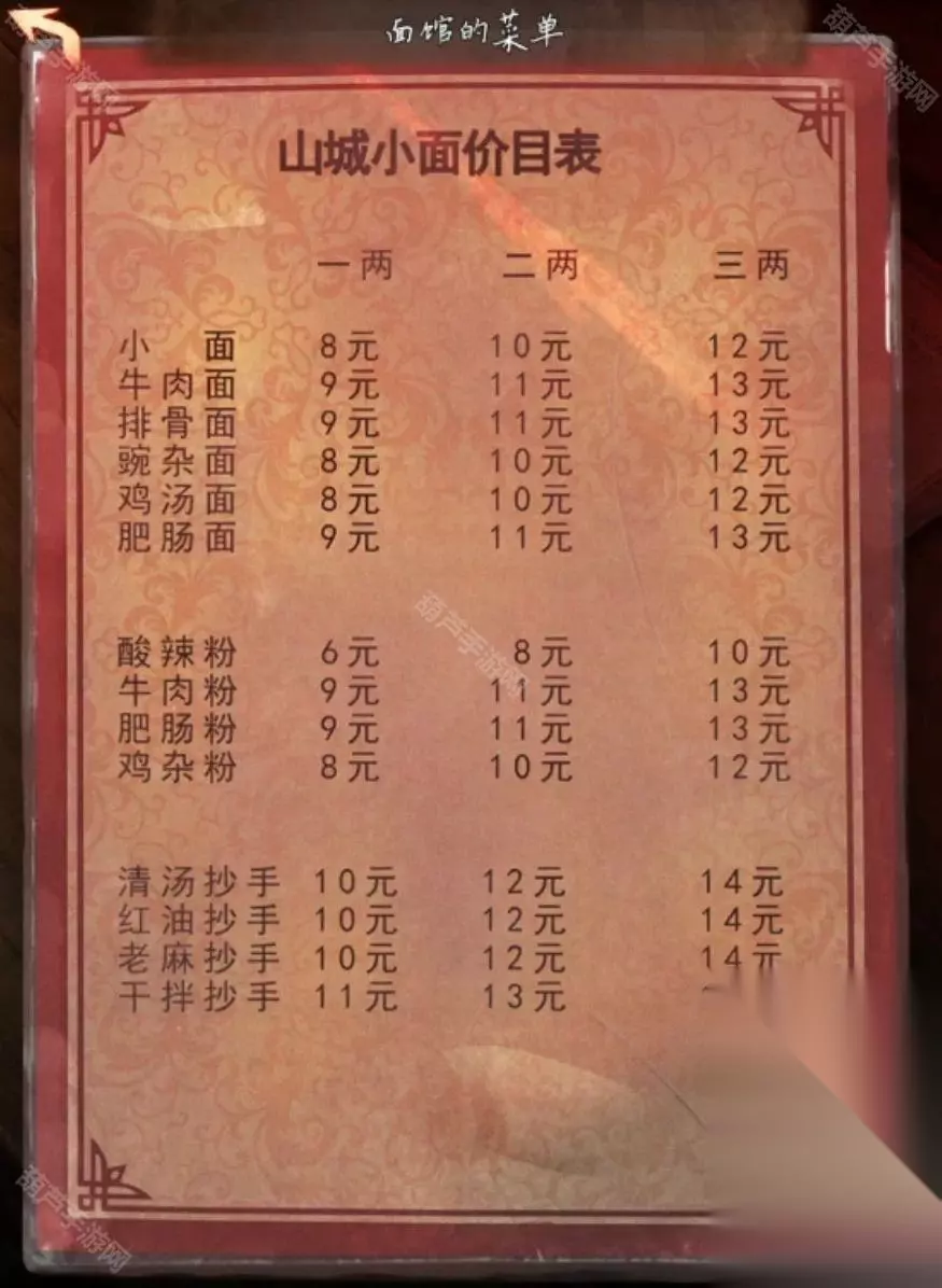 来到面馆,对照着面馆的价目表,算一下一两粉的价格是6+9+9+8=32,二两面的价格是10+11+11+10+10+11=63,三两抄手的价格是14+14+14+15=57,然后按照从上往下的顺序就是面63,粉32,抄手57获得线索633257.