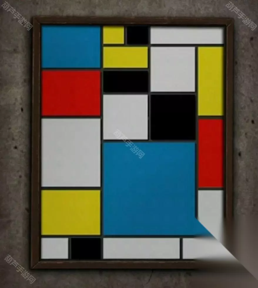 对右上角砚台使用纸灰水后使用半截口红,然后点击墨条磨一磨,使用化妆笔就获得了红色纸灰墨,查看一下右边墙上挂着的色块图,电脑密室提示是红蓝白黄黑,那么数一下色块数量就获得了密码22844, 这张图一会还要有用哦!