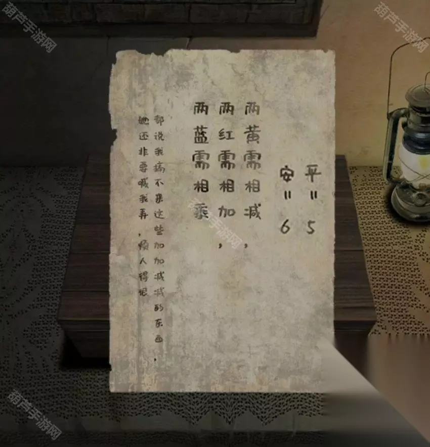 查看右侧的桌子上,盒子旁边放了一张纸条,注意平=5,数一下就知道说的是笔画,中式解谜常见套路,独属于中国人的浪漫哦~所以结合笔记本上红色的无灾需要相加,也就是4+7=11,红色11,蓝色的无病需要相乘,也就是4*10=40,蓝色40,黄色的顺遂需要相减,也就是12-9=3,黄色3.